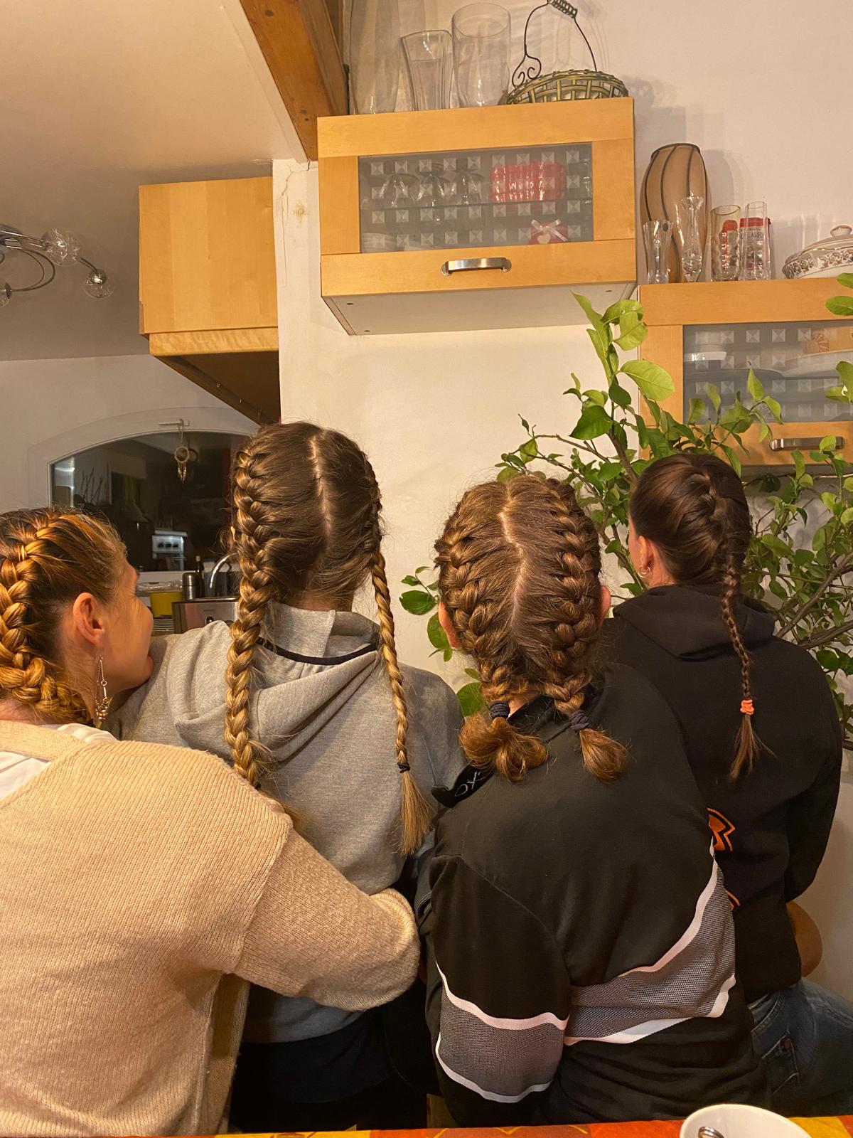 La soirée se passe en douceur : apéro, atelier tresses, prépa des sacs, repas, tisane et dodo.