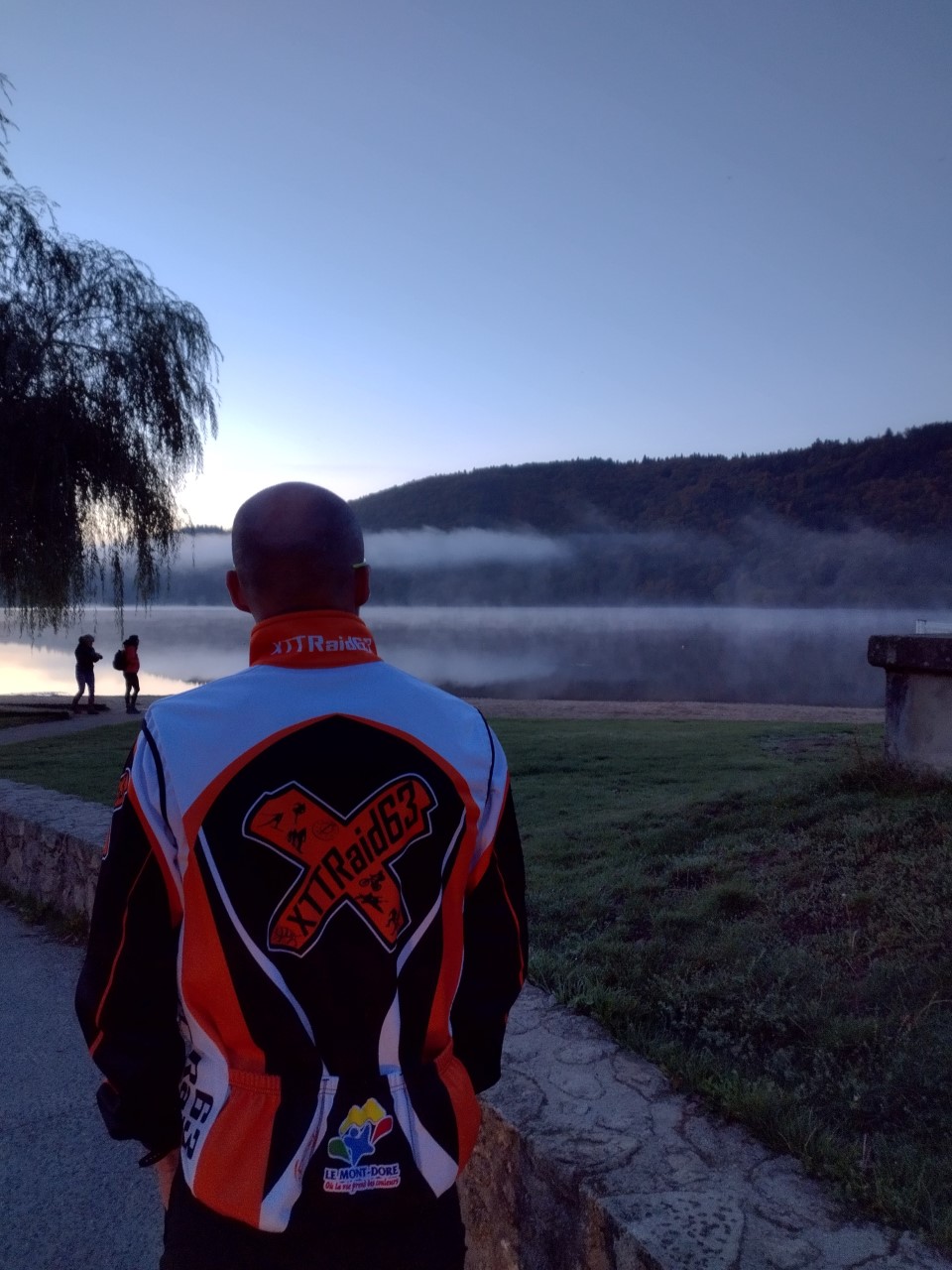 On démarre en course à pied sur les bords du lac Chambon, pour aller chercher les VTT. ça part vite, en côte. Maddy réclame la laisse, autant optimiser tout de suite. On arrive en queue de peloton au parc à vélo, on enfourche nos montures. Après un rapide coup d'œil au profil de cette section, on met la laisse, ça va grimper !