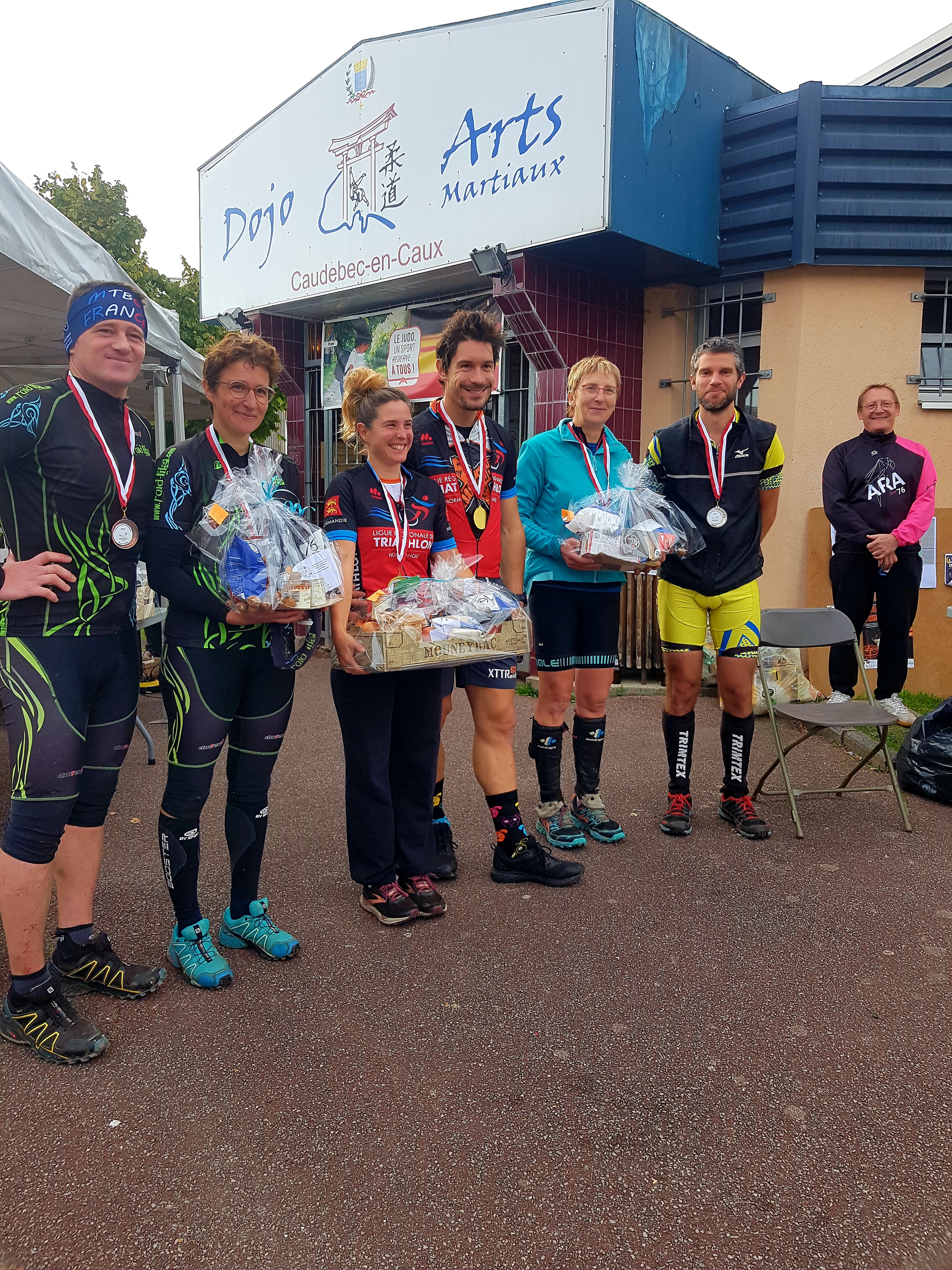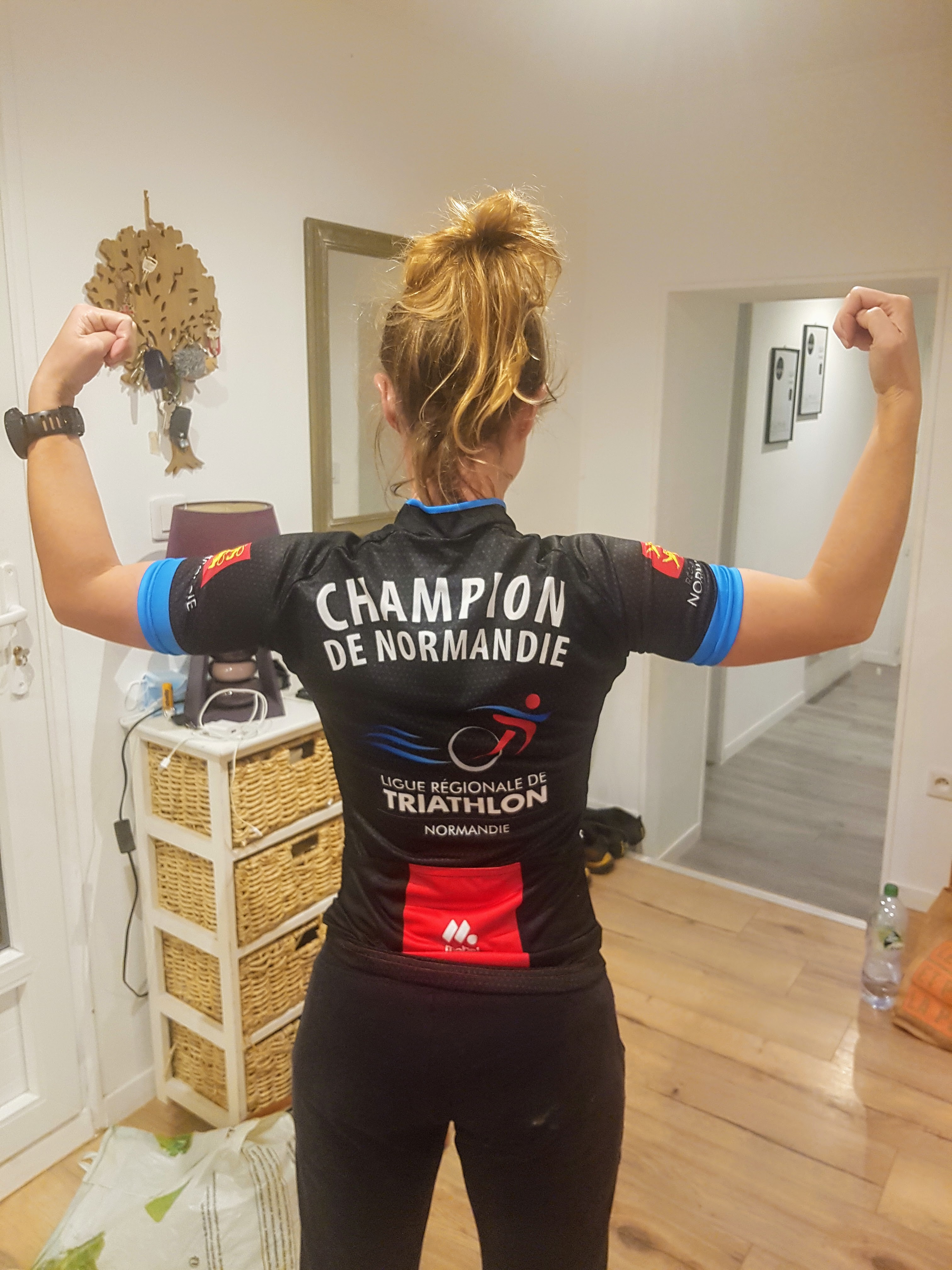 Côté résultat on est 12ème scratch : le niveau est relevé ici en raid, c’est chouette. Et on gagne en mixte, devenant ainsi champions de Normandie, avec maillot et tout ! Visiblement je ne suis pas du gabarit officiel de raideur puisque le maillot fourni était plus un crop top pour moi, mais ce n’est pas grave, l’essentiel est ailleurs : dans le panier garni offert par exemple…