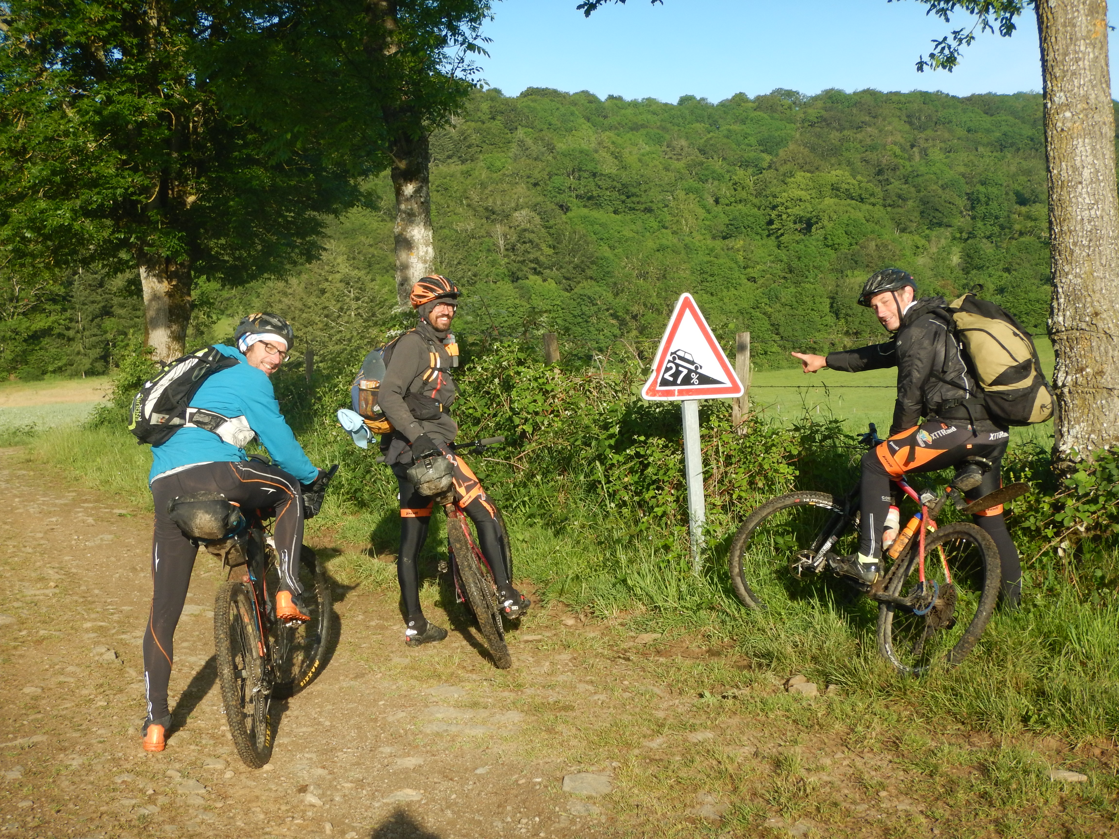 8h la boulangerie. Tournée de viennoiserie qui fait du bien. On remonte sur nos montures, passons l’autoroute et là on admire : Sancy, Chaine des Puys, Vallée de la Sioule et Combrailles en vue. Ca y est on est dedans. C’est le moment que choisi Raganiou pour justifier une pause : punaise j’ai pris le VTT de ma femme et son pneu perd de l’air, grrrr il n’y a pas préventif. C’est tout Caro, elle ne sait pas entretenir un vélo !! Réparation express. On arrive sur Miremont où l’on rejoint officiellement le Tour VTT des Combrailles … mais on le quitte aussitôt, et oui la rustine à prévue une rallonge dont il a le secret : culturel et sauvage => Chartreuse de Port Sainte Marie, Vallée de la Viouze et ses 15 passages à guets, Méandre de Queuille puis remontée laborieuse par le ruisseau de Gagne pour enfin retrouver la trace officielle à Manzat. Durant ce détour pittoresque, lors du repas : Heps la Rustine il y a ton pneu qui arrière qui est tout mou. Yoda c’est toi qui m’a fait une surprise, le pneu est tout mouillé ?! Non non ce sont mes chaussettes qui sèchent. Effectivement la valve fuit, obligé de passer en chambre à air. Chambre à air qui sera remplacé 5 km plus tard car la rustine l’avait mal réparée.