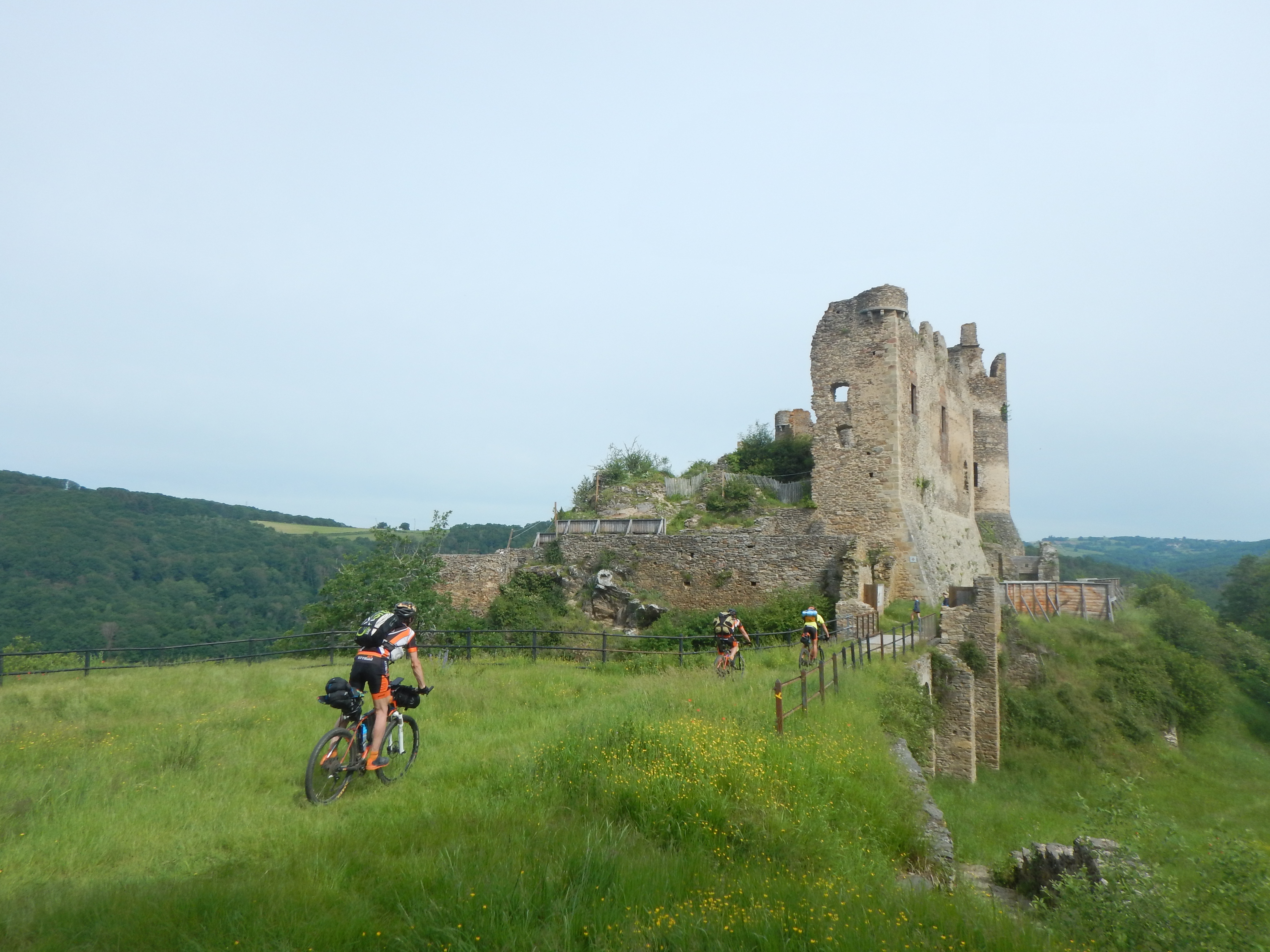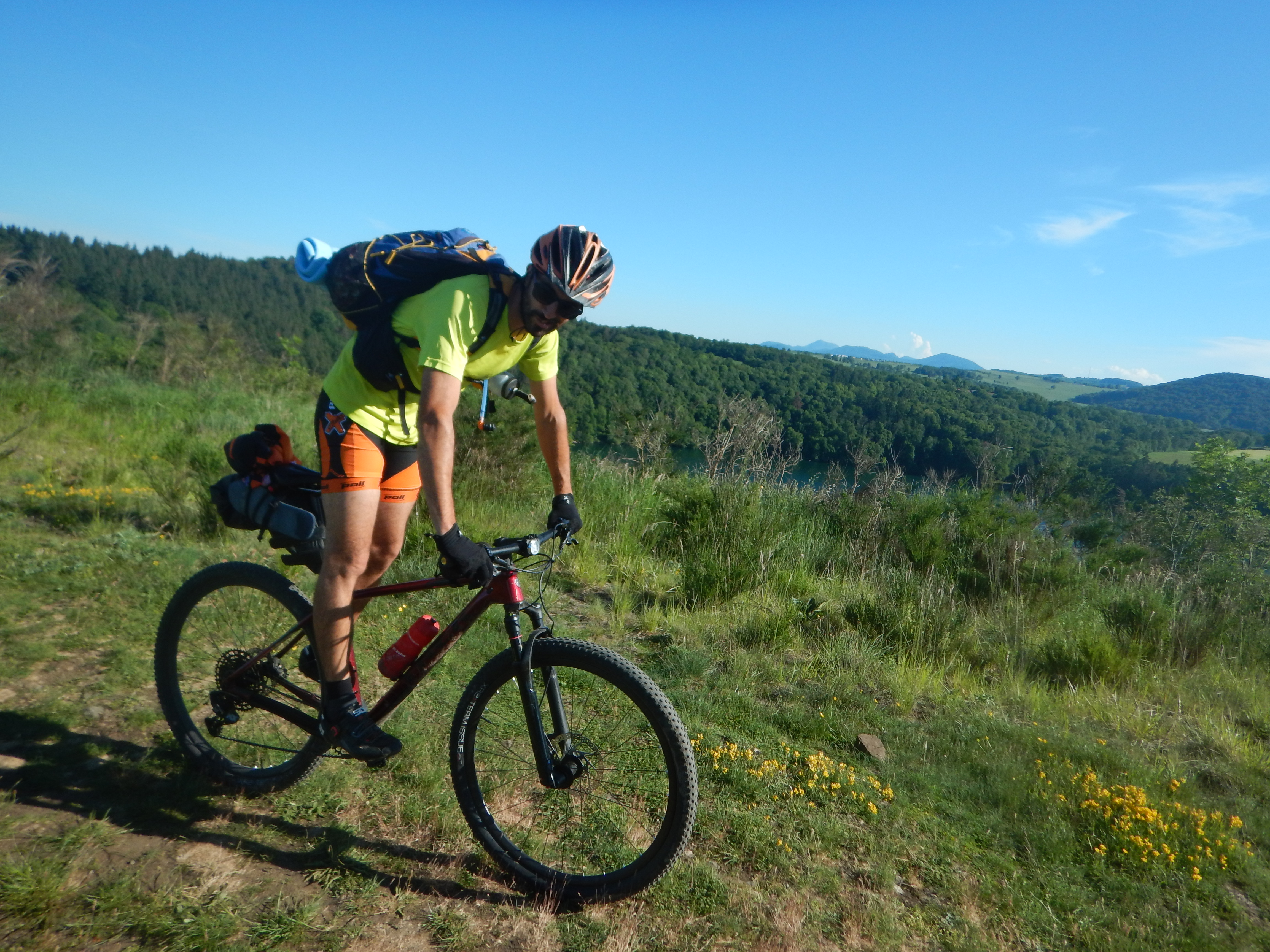 Encore de beaux paysages, des gouttes de transpirations, une chaine cassée (bravo la rustine !!) et nous voilà au château Rocher. Porte d’entrée des gorges de la Sioule. On profite, on analyse pour une prochaine session roller/packraft mais déjà se présente la montée raide et longue vers la base Loisirs de la Prade. Dav id y fait un énième plouf, Raganiou paie sa tournée de Coca et l’on s’attaque à « la Bosse » d’Echassière. Dès lors la route est un peu plus présente, le terrain moins accidenté mais le paysage, les vues ne cessent de nous émerveiller. Purée et dire que l’on n’est jamais venu ici alors que c’est « à côté de la maison ». On mange au sommet de Montaigut, à la table d’orientation. Ça ne s’invente pas ! Il faut chaud, nos gourdes sont vides et l’on se ravitaille au cimetière (comme très souvent).