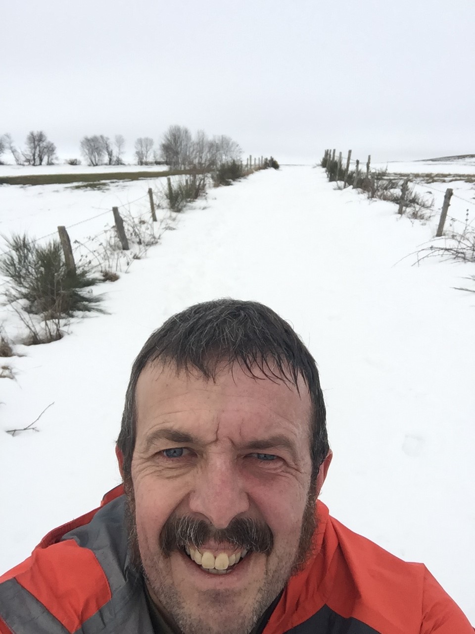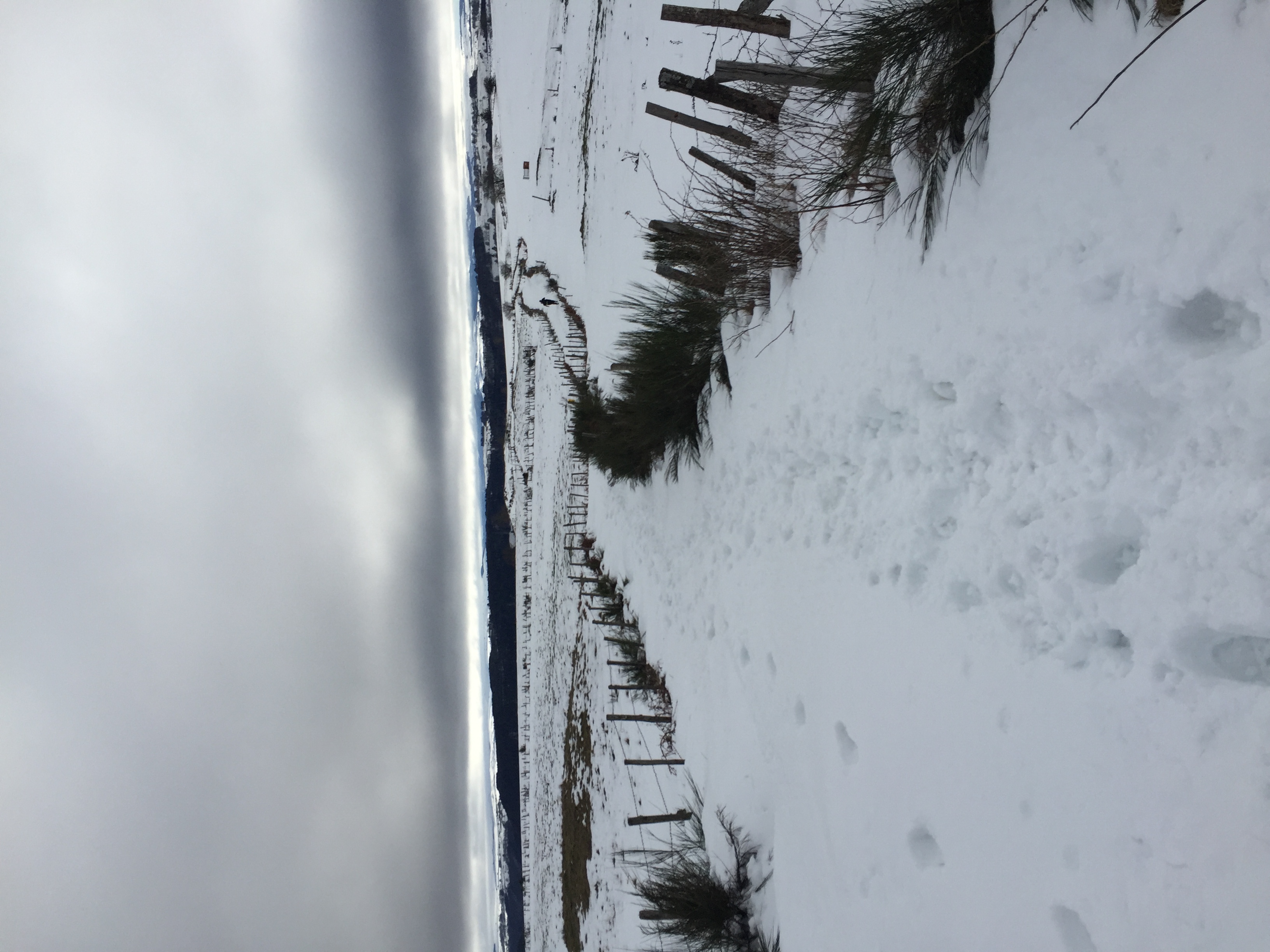 On redescend vers la rivière La Rhue et on se retape une deuxième "patate" où la première féminine me passe devant et un ou deux coureurs du 30km avec des bâtons s'amusent à courir en côte. J'aime bien ce sport qu'est le trail car ça te ramène direct à ta condition et ça te rend humble. On arrive en haut du 2ème plateau et voici le ravito tant attendu que je savais posé vers la moitié de la distance. Un coca, un bout de banane quelques abricots secs, et nous voila reparti dans cette neige si agréable dans les descentes bien qu'un peu piégeuse pour les appuis. Après une bonne traversée du plateau avec quelques coups de vent bien frisquet, on redescend par un GR bien caillouteux et là patatra... à 2 km de l'arrivée, un caillou mal placé me fait tordre la cheville et je tombe dans la boue. Je peste maintenant contre ce sport et repars tant bien que mal en claudiquant. Je termine en alternant la marche et la course.