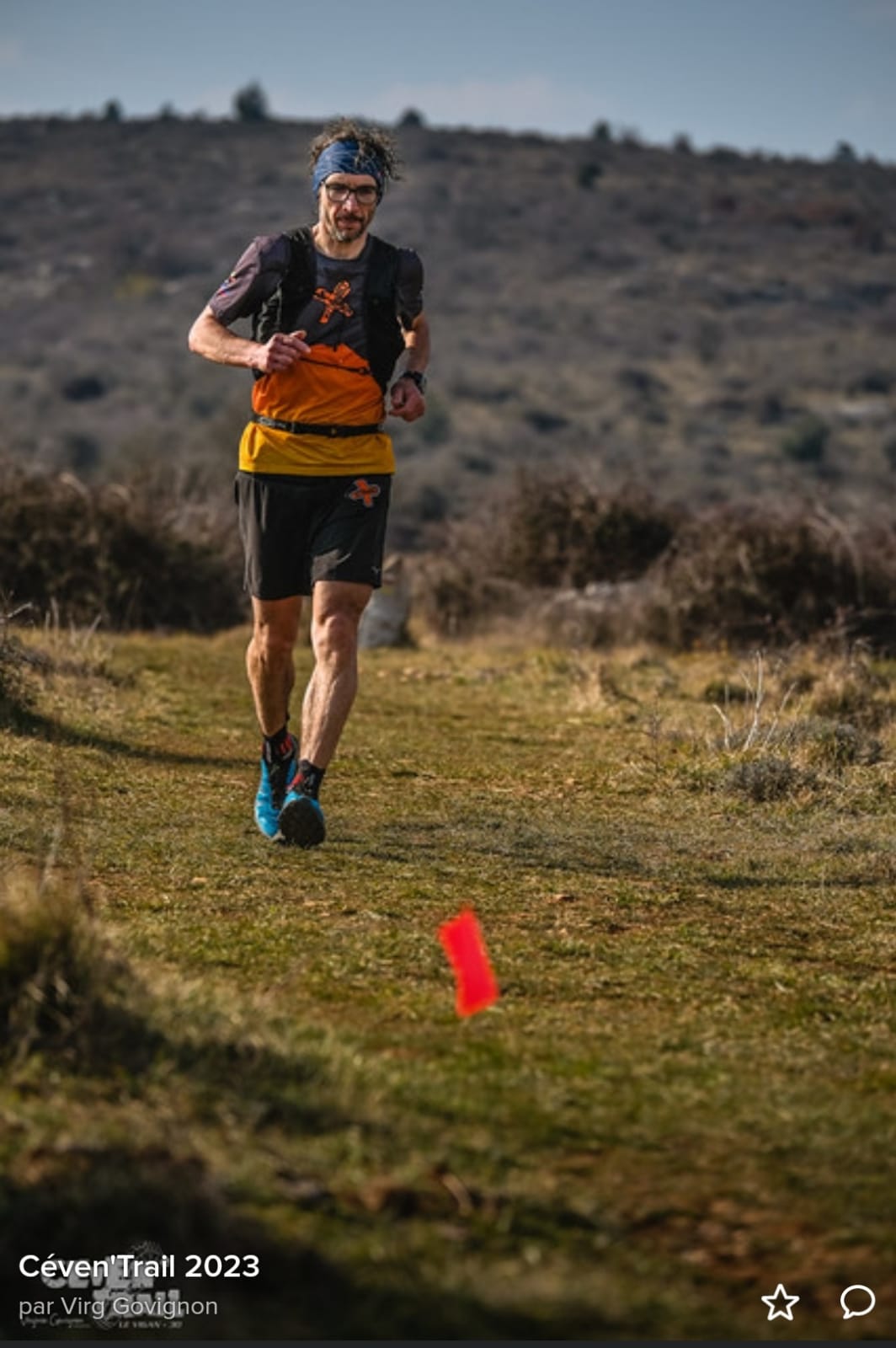 J’essais de ne pas y penser et me concentre sur la beauté du paysage au levé du soleil. Il va pouvoir nous réchauffer. Je m’enflamme un peu avec un autre coureur, mais je ne me pose pas plus de questions, je suis bien, les kms défilent sur des sentiers et chemins agréables à courir. J’arrive à la base vie d’ARRE au km53 et 2700md+ en 7h35. Je n’ai pas d’assistance, je porte donc toutes les poches pour chaque ravito. Je sors celle prévue pour cette base et déballe sur la table ma compote et gels. Le bénévole me propose gentiment de remplir mes flasques, je mange une part de cake et me sauve en reprenant ma course. La montée suivante est bien raide 11km-550md+ et au sommet j’ai un sentiment de devoir accompli, je n’ai rien lâché en 1h20. Je vais pouvoir savourer ma compote. Sauf que horreur, je m’aperçois que je suis reparti de la base vie sans mon ravito, la bourde ! Je me rattrape sur le prochain ravito en dévorant une banane. J’apprends que Murielle a passé la BH, je suis content pour elle, elle va pouvoir continuer son aventure.