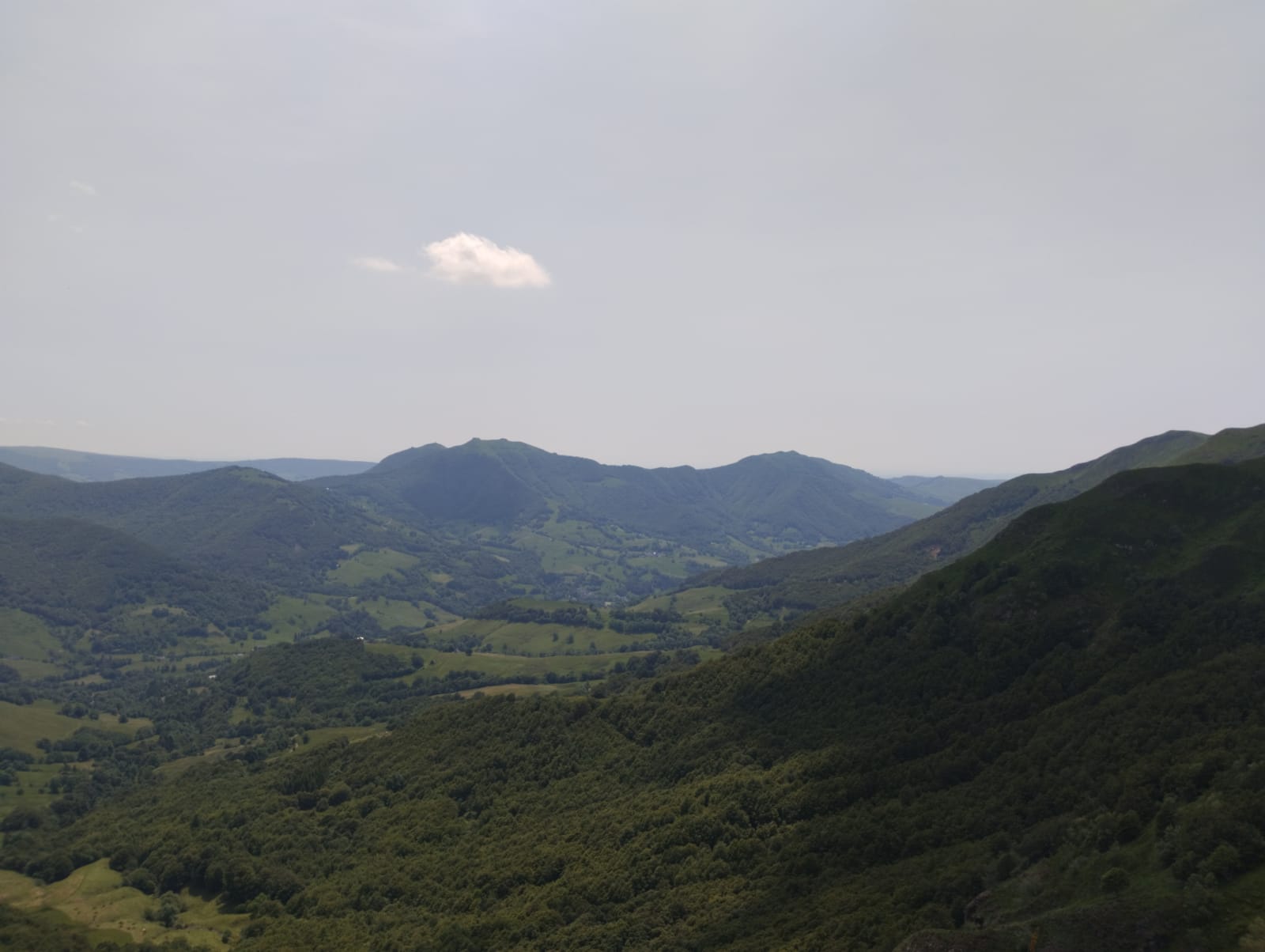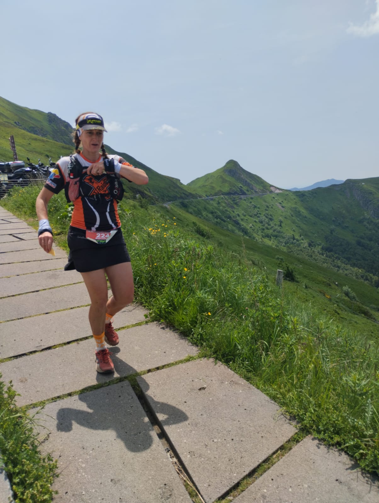 Je retrouve Cyril au Pas de Peyrol, quelques mots d'encouragement , quelques oranges fraiches et je repas bien motivée pour la fin car là c'est quasi gagné! Il m'annonce 1h45/2h pour relier Mandailles . Mes chevilles commencent à moyennement aimer les chemins cabossés et les pâturages. Dans la montée de Chavaroche je retrouve Céline une copine qui m'encourage, je monte vraiment bien . Au sommet le temps d'admirer la vue et c'est la descente vers Mandailles .